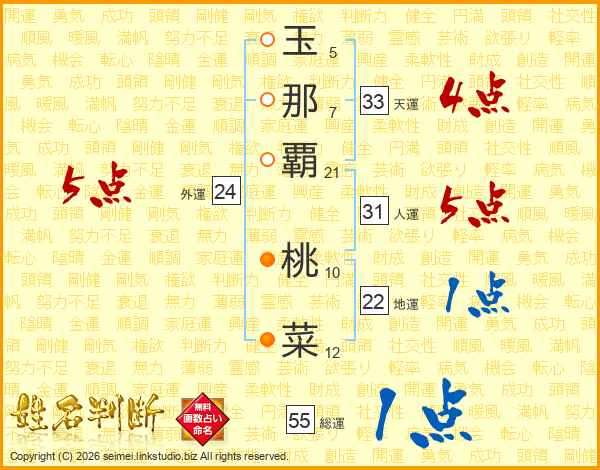 玉(5画)那(7画)覇(21画) 桃(10画)菜(12画)