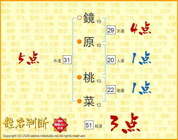 鏡(19画)原(10画) 桃(10画)菜(12画)