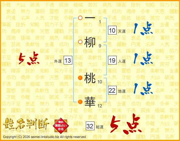 生活面を象徴する運勢です。外部から受ける影響力を表し、結婚運、家庭運や職場、環境への順応性を表します。総運から人運を引いた画数。姓や名が1文字の場合を除く。