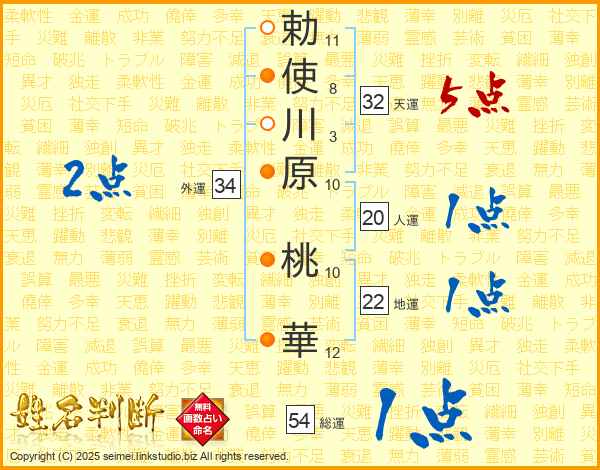 勅(11画)使(8画)川(3画)原(10画) 桃(10画)華(12画)