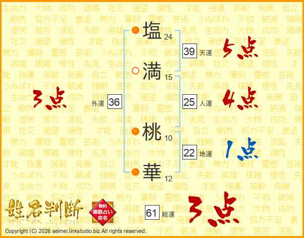 塩(24画)満(15画) 桃(10画)華(12画)