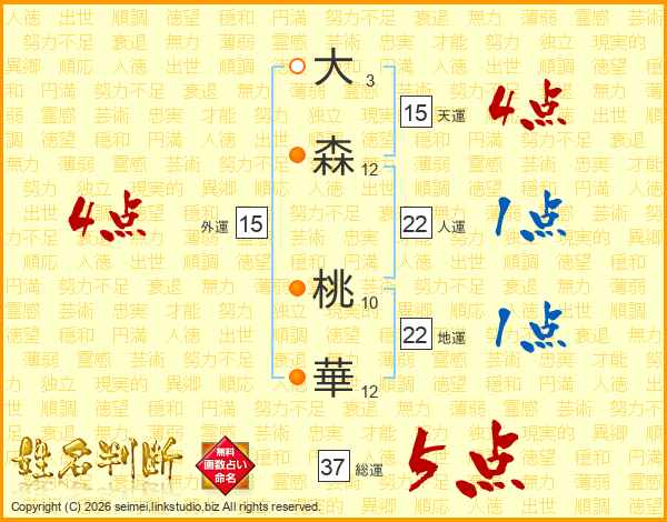 あなたの人生を表す1番重要な運勢です。生涯を通じて影響する総合運となり、主に50歳以降の晩年期に影響を及ぼします。苗字と名前の合計画数。