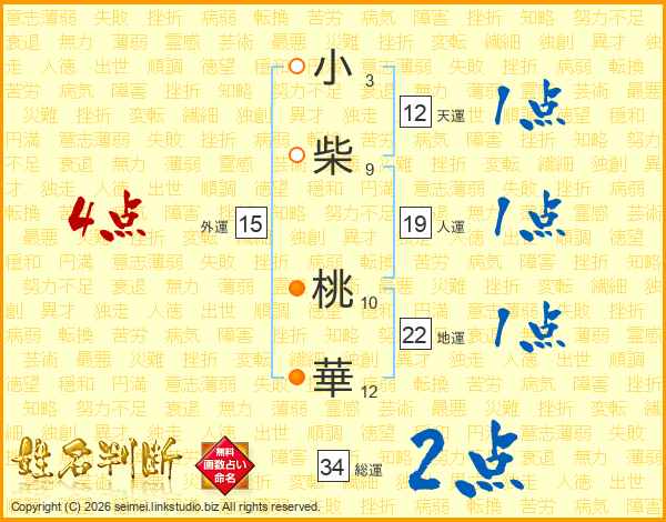 生活面を象徴する運勢です。外部から受ける影響力を表し、結婚運、家庭運や職場、環境への順応性を表します。総運から人運を引いた画数。姓や名が1文字の場合を除く。