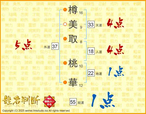 樽(16画)美(9画)取(8画) 桃(10画)華(12画)