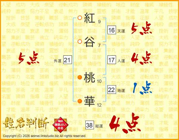紅(9画)谷(7画) 桃(10画)華(12画)