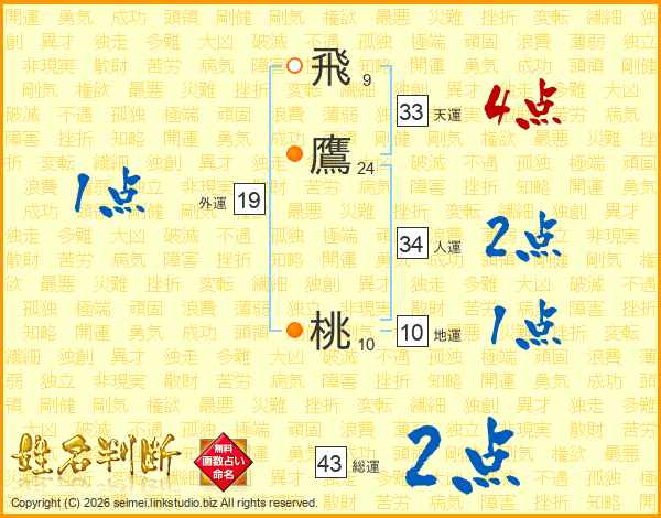 飛(9画)鷹(24画) 桃(10画)