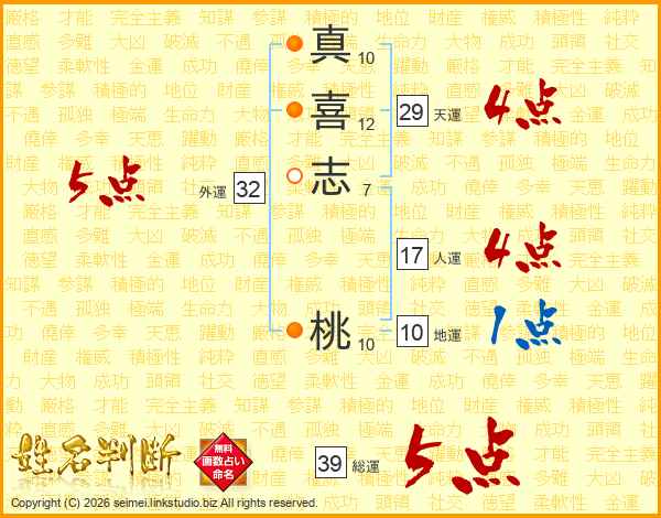 あなたの人生を表す1番重要な運勢です。生涯を通じて影響する総合運となり、主に50歳以降の晩年期に影響を及ぼします。苗字と名前の合計画数。