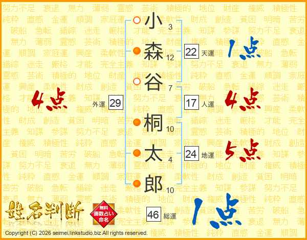 小(3画)森(12画)谷(7画) 桐(10画)太(4画)郎(10画)