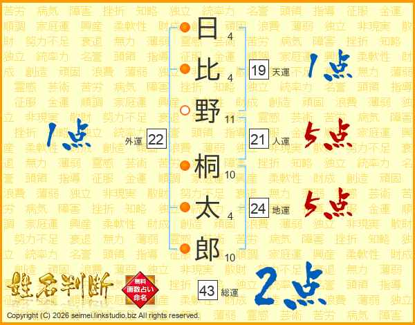 日(4画)比(4画)野(11画) 桐(10画)太(4画)郎(10画)