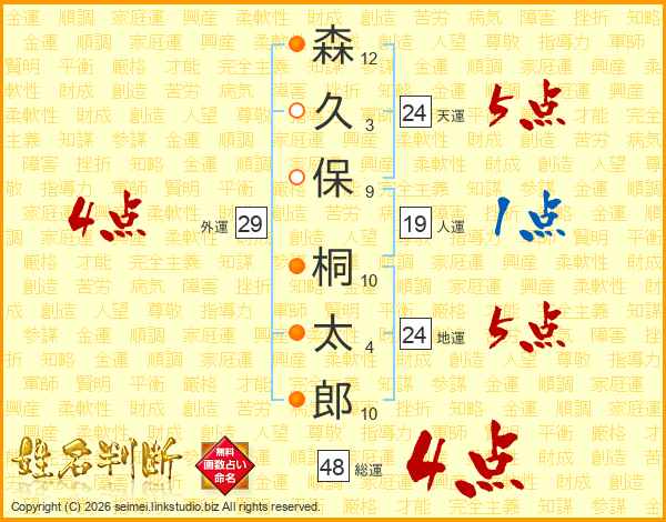 森(12画)久(3画)保(9画) 桐(10画)太(4画)郎(10画)