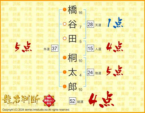 橋(16画)谷(7画)田(5画) 桐(10画)太(4画)郎(10画)