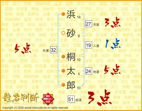 浜砂桐太郎さんの総運は51画の3点!