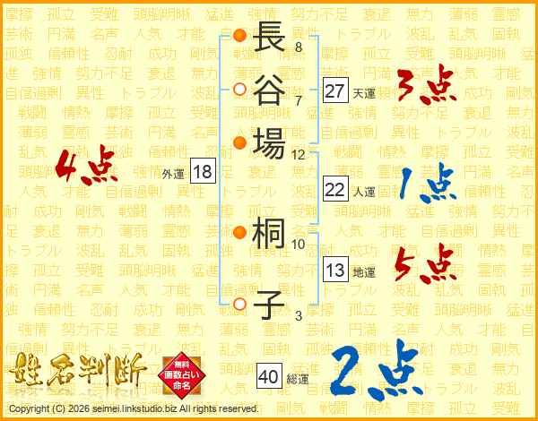 長(8画)谷(7画)場(12画) 桐(10画)子(3画)