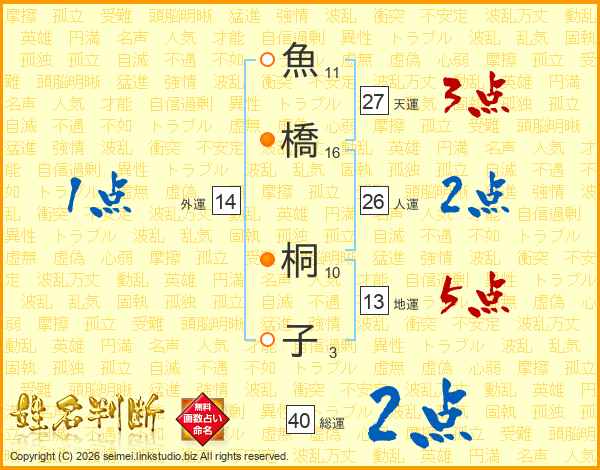 魚橋桐子さんの人運は26画の2点!