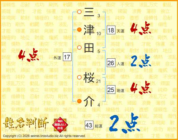三津田桜介さんの人運は26画の2点!