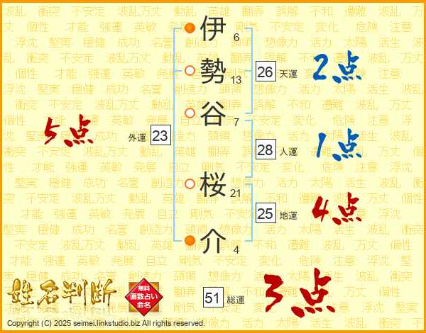 伊勢谷桜介さんの総運は51画の3点!