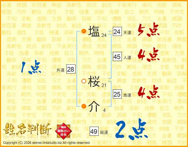 生活面を象徴する運勢です。外部から受ける影響力を表し、結婚運、家庭運や職場、環境への順応性を表します。総運から人運を引いた画数。姓や名が1文字の場合を除く。