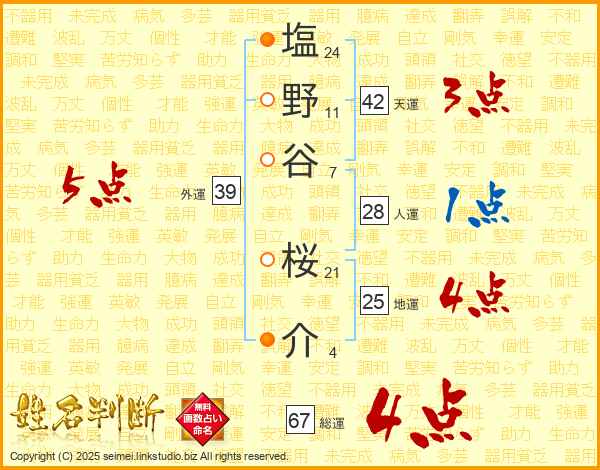 塩野谷桜介さんの地運は25画の4点!