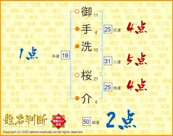 御(11画)手(4画)洗(10画) 桜(21画)介(4画)