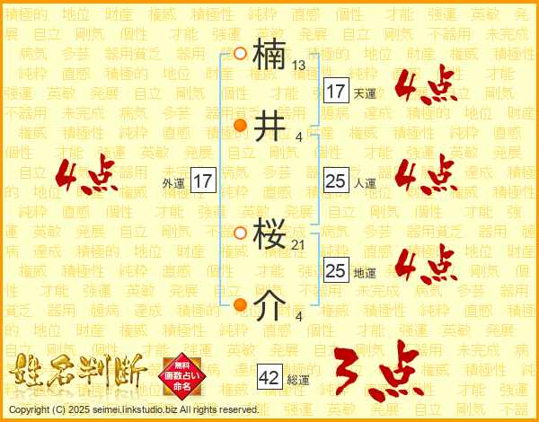 生活面を象徴する運勢です。外部から受ける影響力を表し、結婚運、家庭運や職場、環境への順応性を表します。総運から人運を引いた画数。姓や名が1文字の場合を除く。