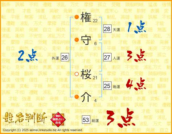 あなたの人生を表す1番重要な運勢です。生涯を通じて影響する総合運となり、主に50歳以降の晩年期に影響を及ぼします。苗字と名前の合計画数。
