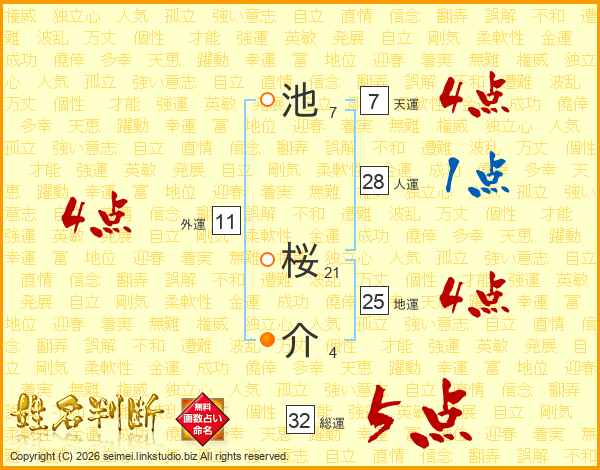 あなたの人生を表す1番重要な運勢です。生涯を通じて影響する総合運となり、主に50歳以降の晩年期に影響を及ぼします。苗字と名前の合計画数。