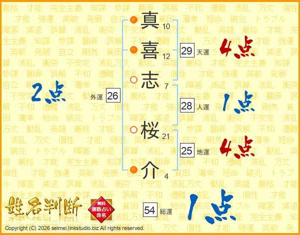 真(10画)喜(12画)志(7画) 桜(21画)介(4画)