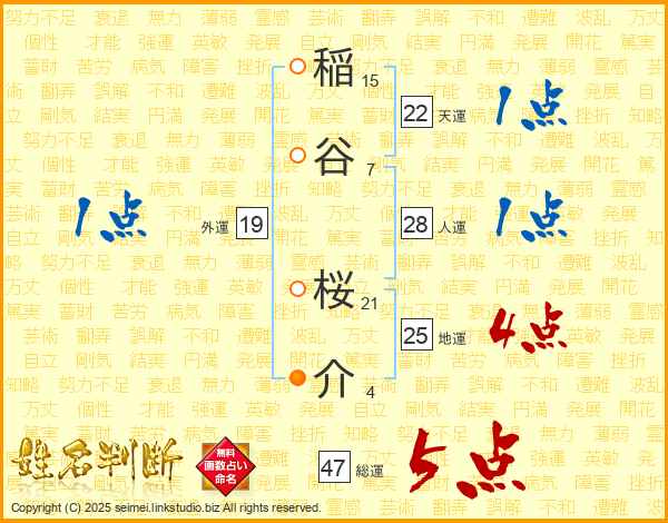 稲(15画)谷(7画) 桜(21画)介(4画)