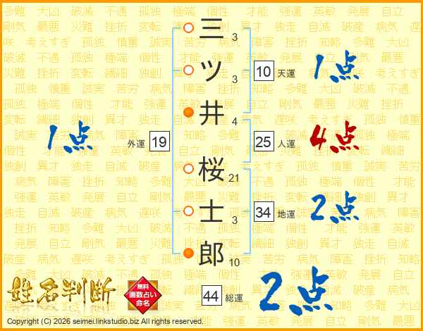 三ツ井桜士郎さんの総運は44画の2点!