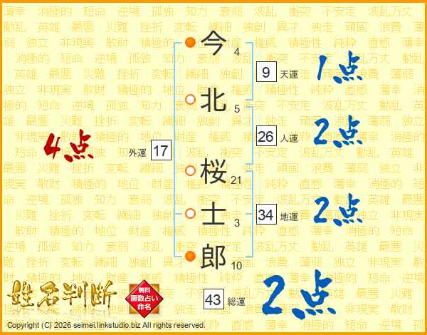 今北桜士郎さんの総運は43画の2点!