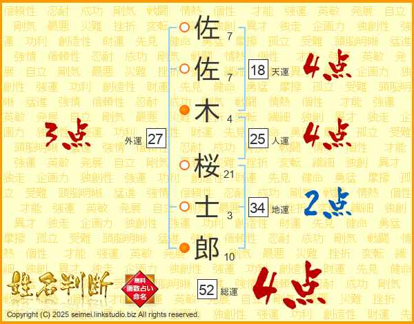 佐(7画)佐(7画)木(4画) 桜(21画)士(3画)郎(10画)