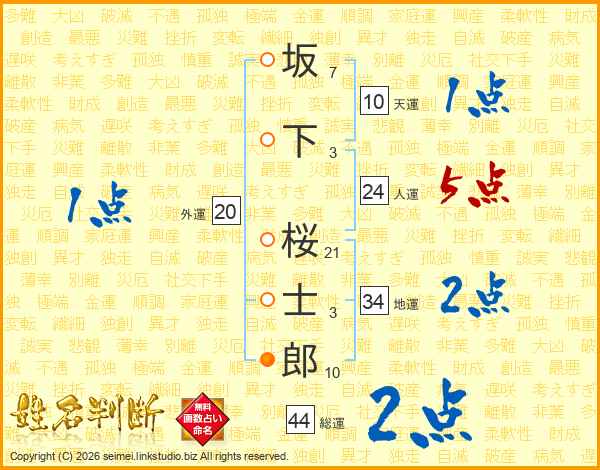 坂(7画)下(3画) 桜(21画)士(3画)郎(10画)
