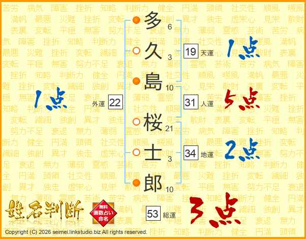 多(6画)久(3画)島(10画) 桜(21画)士(3画)郎(10画)