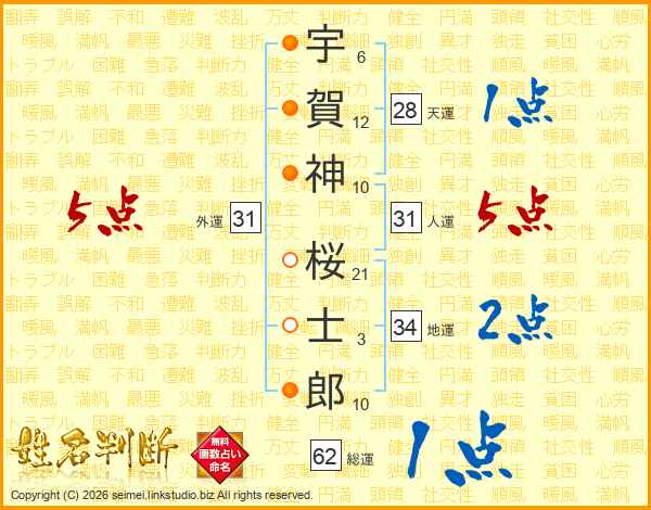 宇賀神桜士郎さんの人運は31画の5点!