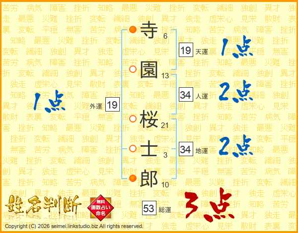 寺(6画)園(13画) 桜(21画)士(3画)郎(10画)