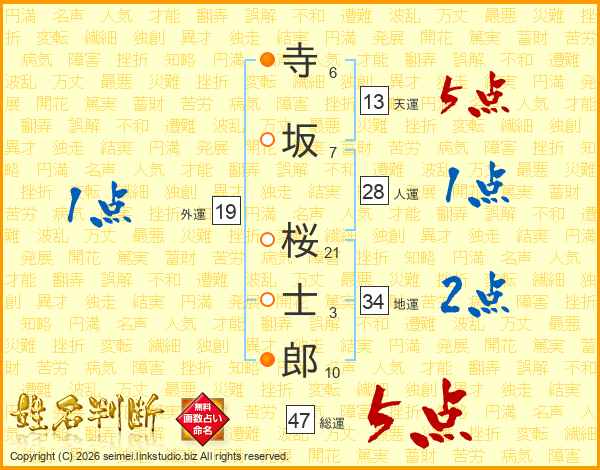 寺坂桜士郎さんの総運は47画の5点!
