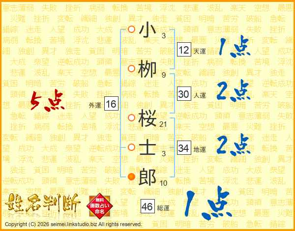 小(3画)栁(9画) 桜(21画)士(3画)郎(10画)