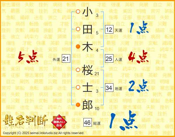 小(3画)田(5画)木(4画) 桜(21画)士(3画)郎(10画)