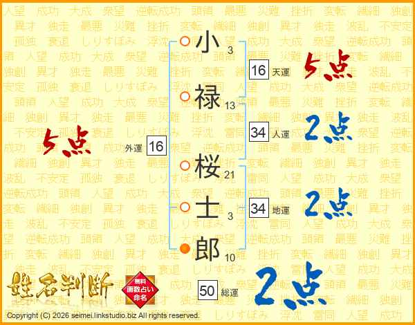 小(3画)禄(13画) 桜(21画)士(3画)郎(10画)