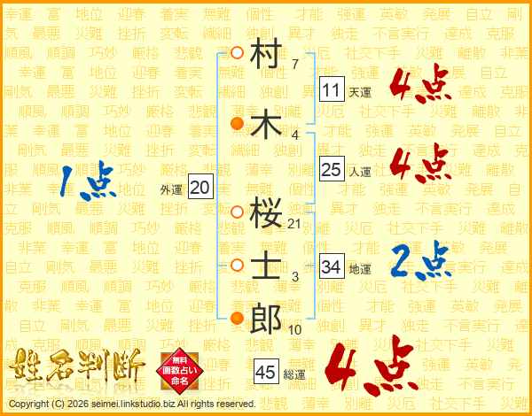 村(7画)木(4画) 桜(21画)士(3画)郎(10画)