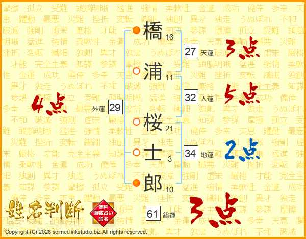 橋(16画)浦(11画) 桜(21画)士(3画)郎(10画)