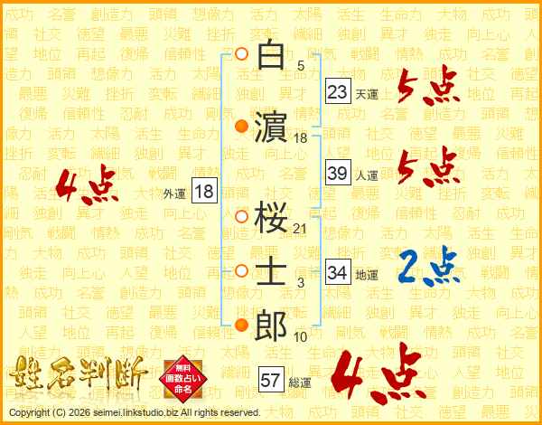 白(5画)濵(18画) 桜(21画)士(3画)郎(10画)
