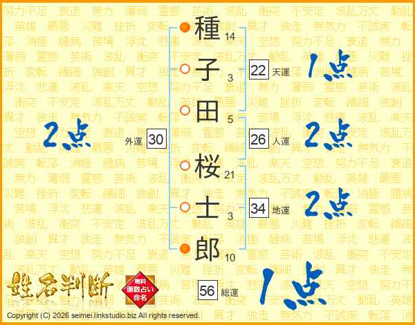 種(14画)子(3画)田(5画) 桜(21画)士(3画)郎(10画)