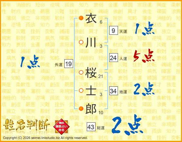 衣川桜士郎さんの人運は24画の5点!