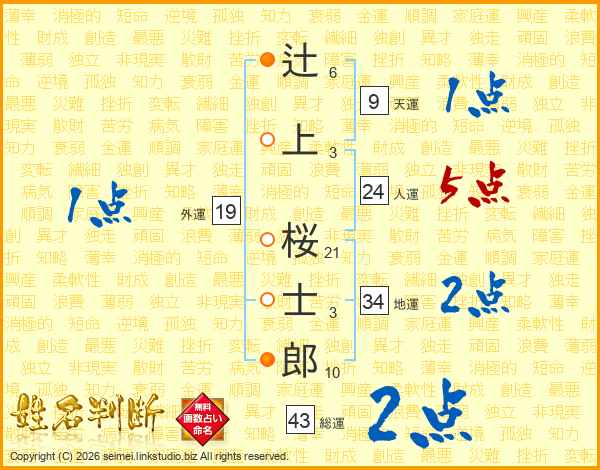 辻(6画)上(3画) 桜(21画)士(3画)郎(10画)