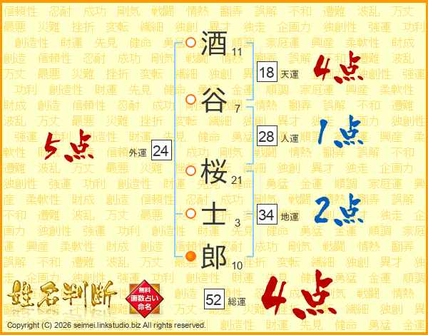 酒(11画)谷(7画) 桜(21画)士(3画)郎(10画)