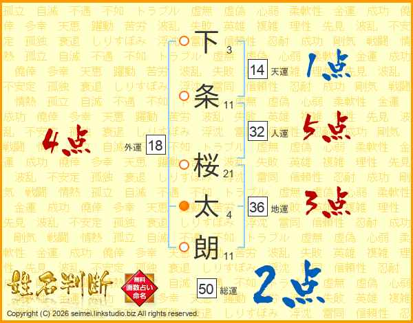 下(3画)条(11画) 桜(21画)太(4画)朗(11画)
