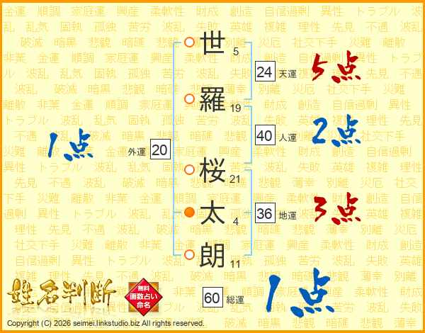世(5画)羅(19画) 桜(21画)太(4画)朗(11画)