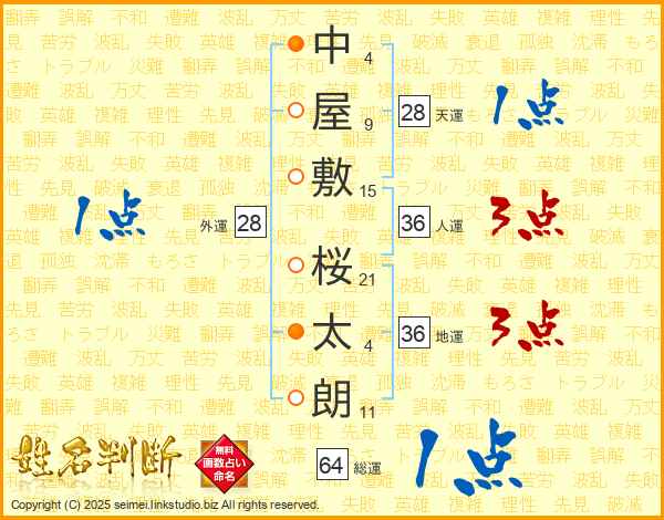 中(4画)屋(9画)敷(15画) 桜(21画)太(4画)朗(11画)