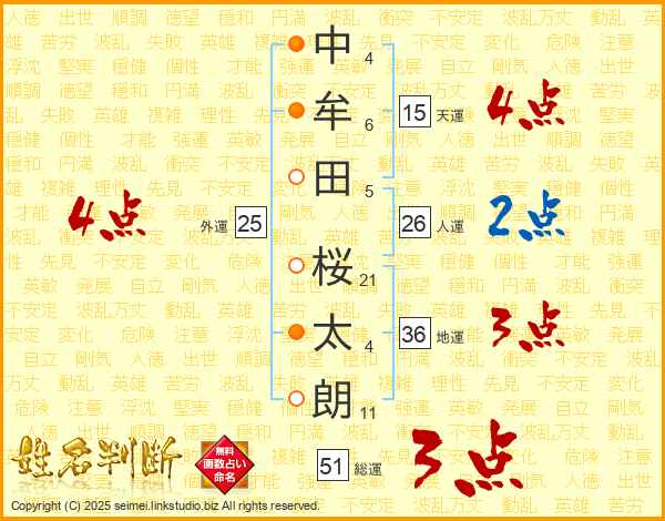 中(4画)牟(6画)田(5画) 桜(21画)太(4画)朗(11画)
